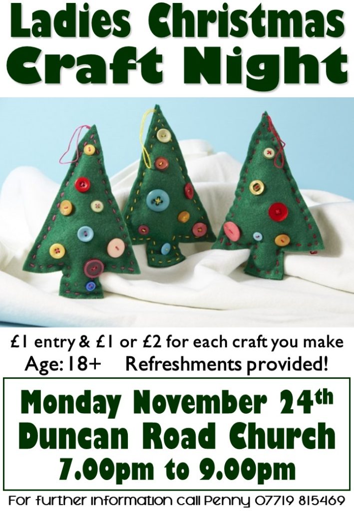 DATE FOR THE DIARY: What: Ladies Christmas Craft Night When: Monday November 24th – 7.00pm to 9.00pm Where: Duncan Road Church. SO31 1BD Who: Ladies Age: 18+ Cost: £1 entry & £1 or £2 for each craft you make